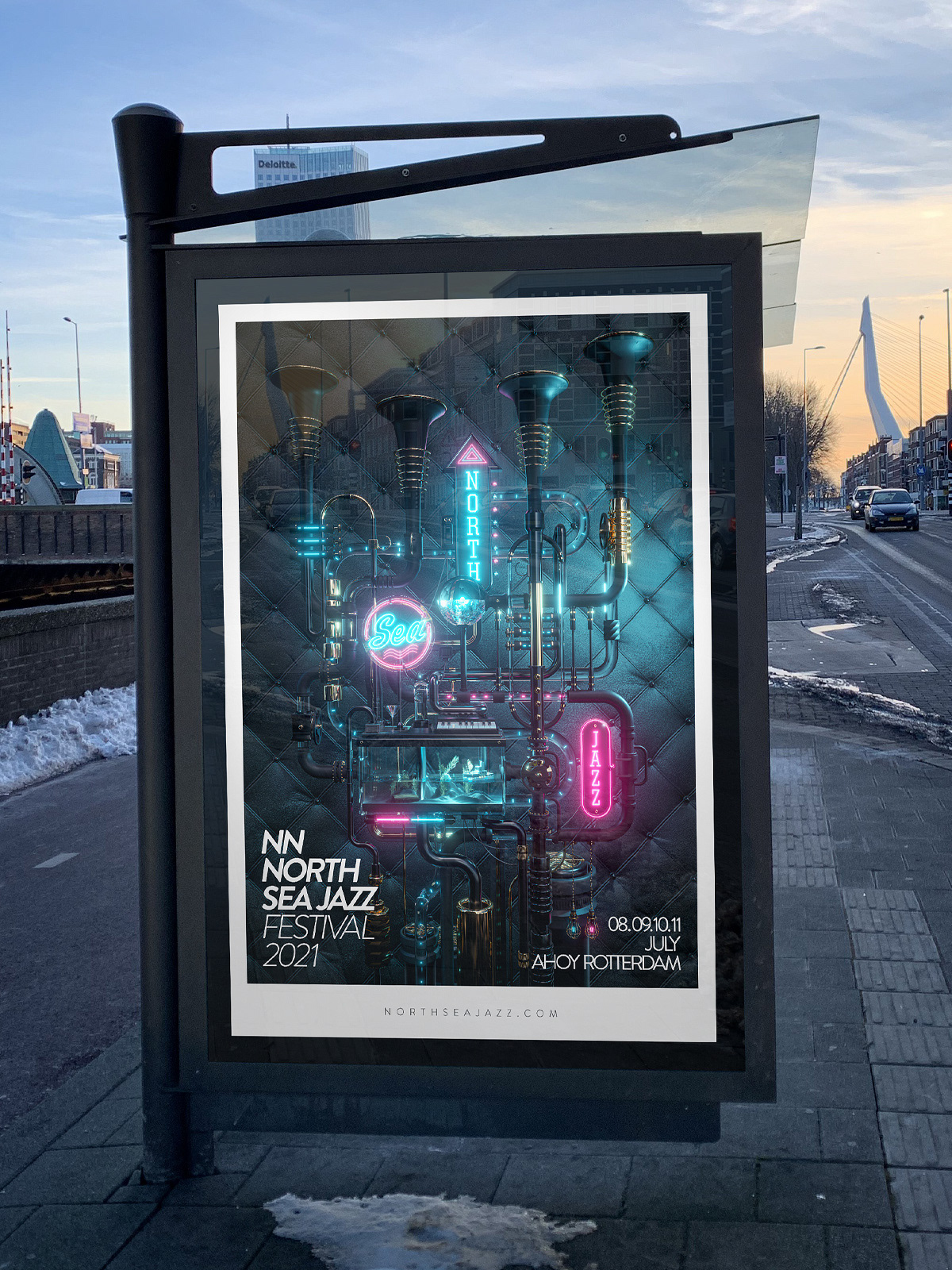 The artwork was based on the themes of the industrial elements of the city of Rotterdam and its harbour, combined with a neon-light jazz-club vibe and off course... trumpets :)